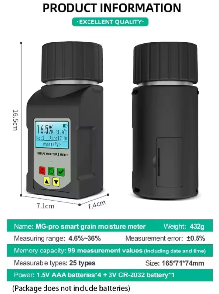 Alta precisión y consistencia: Logre lecturas precisas de humedad de grano con una precisión líder en la industria de ±0,5 %, incluso en diversas condiciones ambientales.Asegúrese de que cada medición sea confiable, brindándole total confianza en la calidad de sus granos.